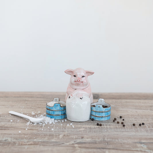Set de 2 Recipientes Vintage en Loza con Cucharita, Forma de Cerdito