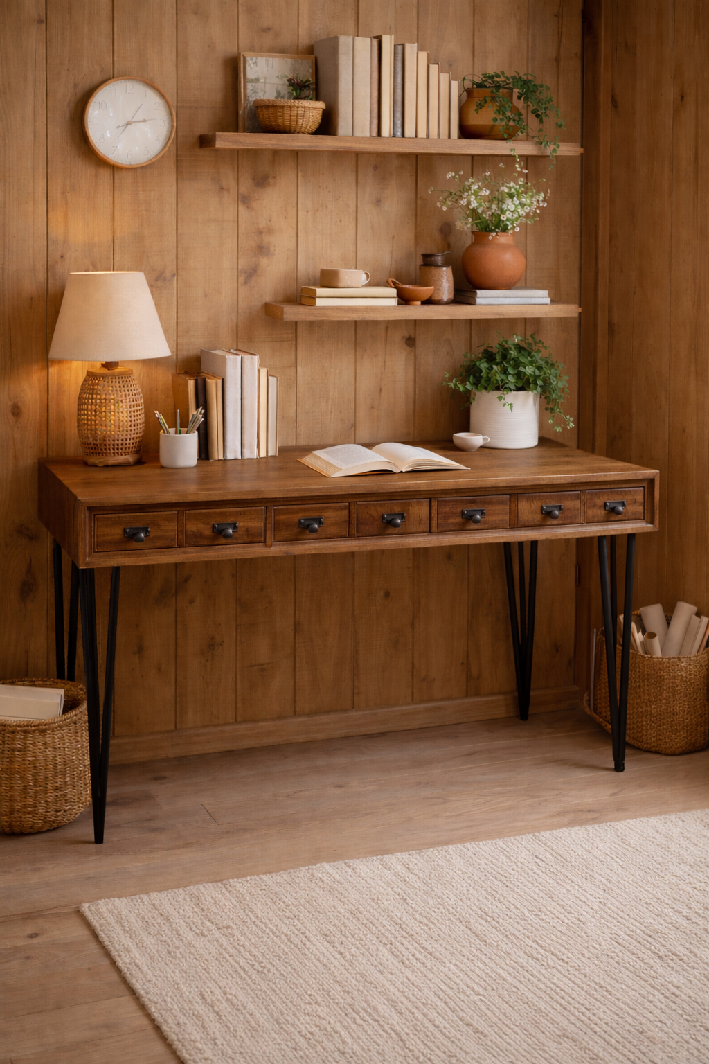 Este arrimo no solo cumple con su función de almacenamiento y organización, sino que también es una pieza decorativa que realza cualquier espacio. Ideal para el recibidor, la sala de estar o el comedor, su diseño versátil se adapta a diversos estilos de decoración, desde industrial hasta contemporáneo.