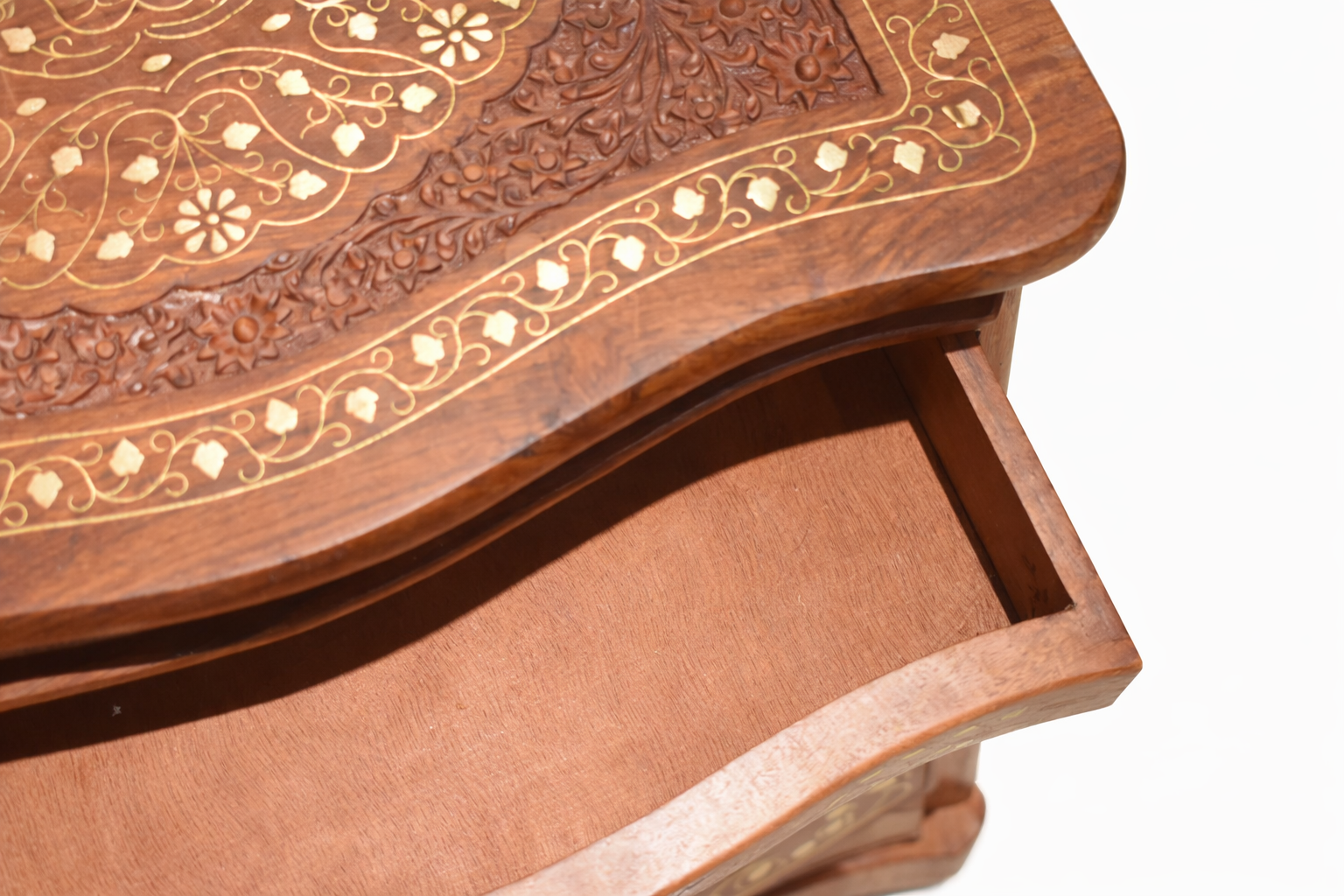 El palo de rosa, apreciado por su tonalidad cálida y su grano único, proporciona una base sólida y duradera para guardar tus pertenencias personales con estilo. Los detalles en bronce, meticulosamente tallados a mano, realzan la belleza natural de la madera y destacan la habilidad artesanal y la rica herencia cultural de la India.