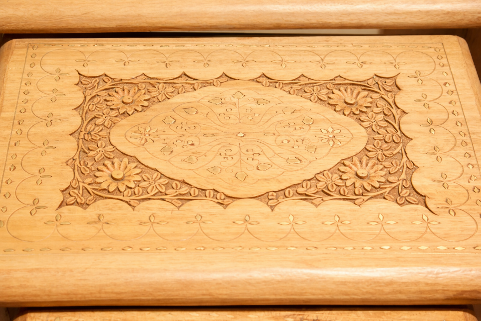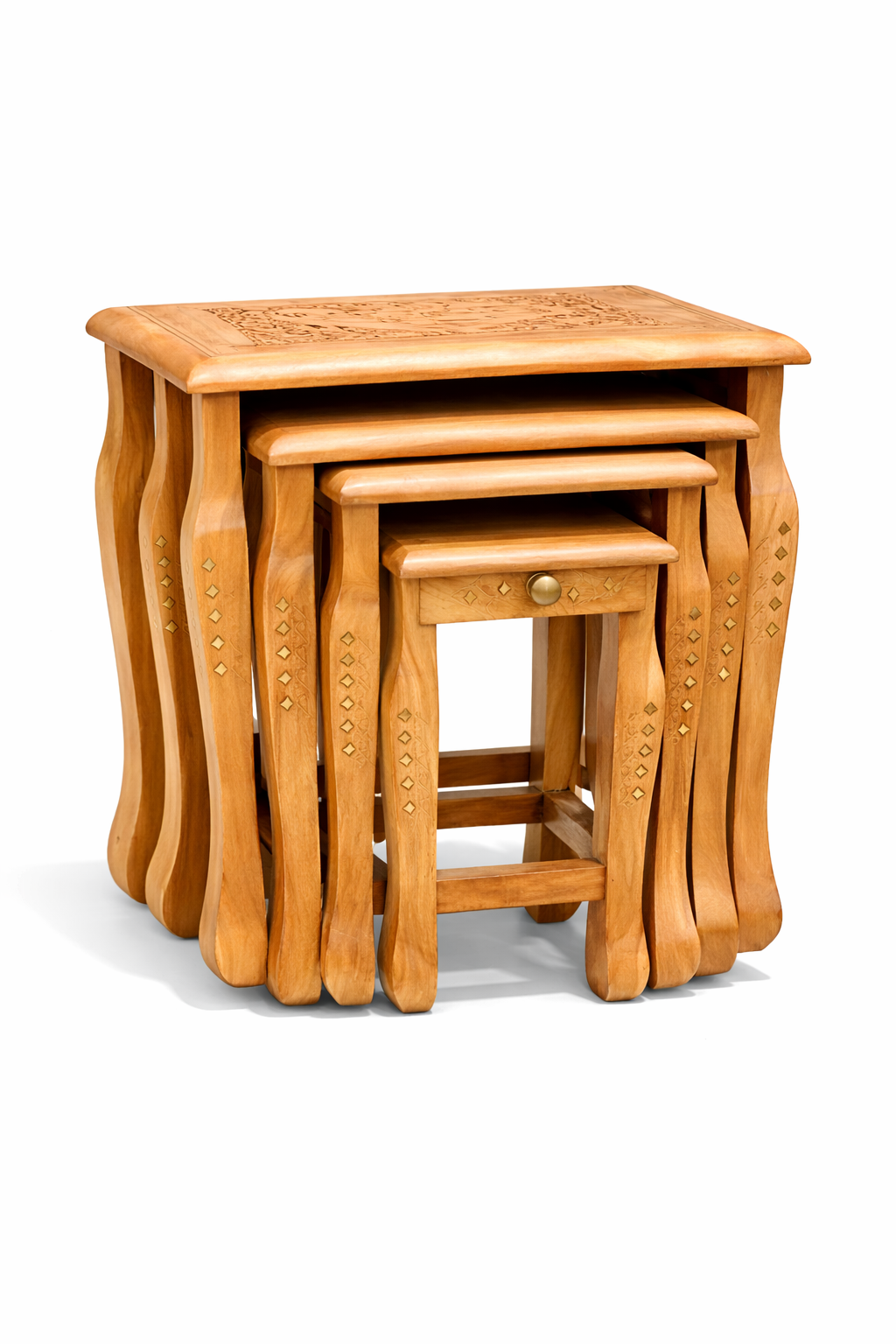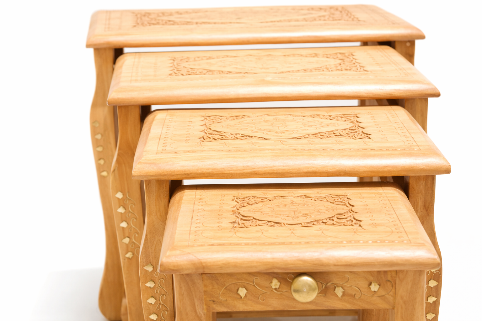 Juego de 4 Mesas Avind – Artesanía de Palo de Rosa y Bronce Tallado a Mano