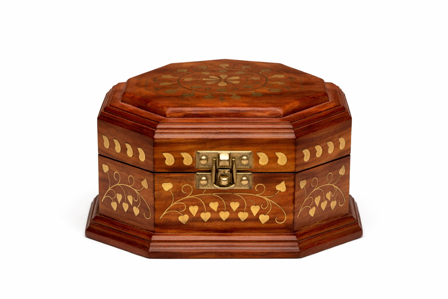 Un joyero octagonal de elegante diseño y alto en precioso palo de rosa, con incrustaciones en bronce. Con un diámetro de 14.8 cm y una altura de 9 cm, este joyero destaca por su forma única y la artesanía detallada que resalta el grano natural de la madera. Ideal para guardar y exhibir tus joyas más preciadas, combina funcionalidad con un toque artístico que añade elegancia a cualquier espacio. Perfecto para aquellos que aprecian la calidad y la belleza de las piezas artesanales en su decoración interior.