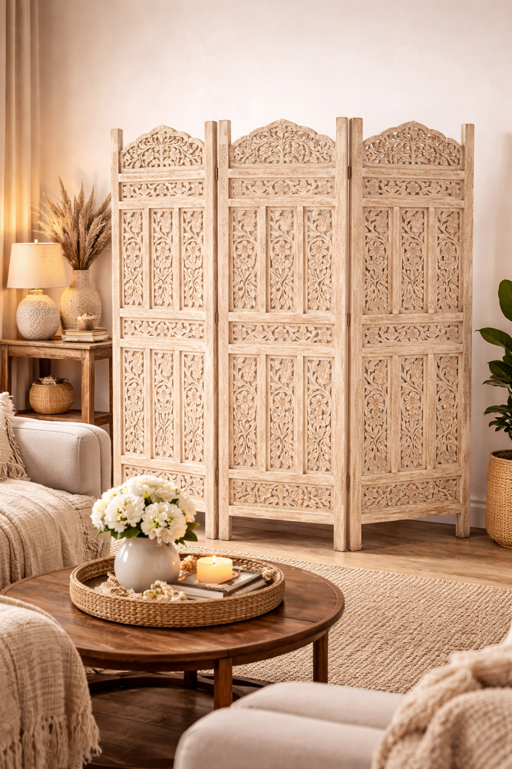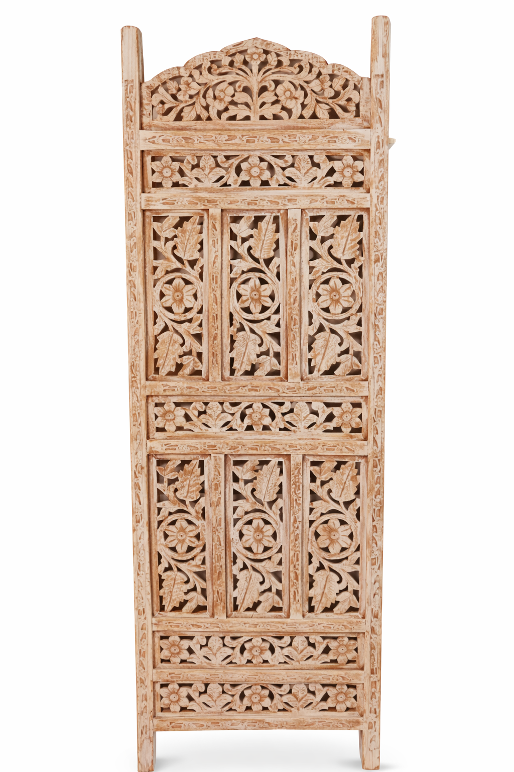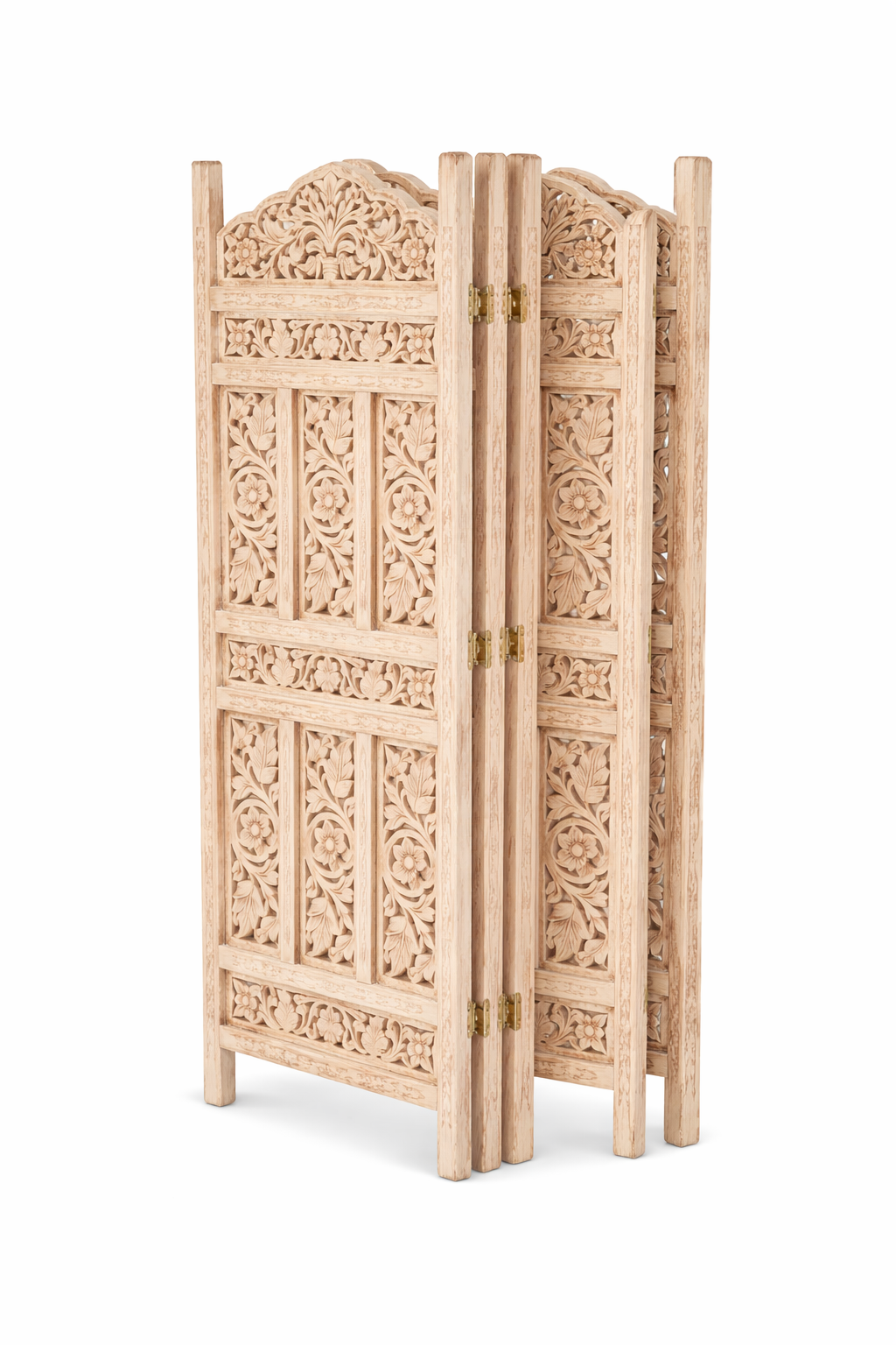 Este biombo artesanal es una pieza decorativa de alto valor estético y funcional, elaborada en palo de rosa de la India, una madera noble reconocida por su durabilidad, veta elegante y calidez natural. Cada hoja ha sido tallada completamente a mano, reflejando un trabajo artesanal minucioso con detalles florales y geométricos que aportan carácter y sofisticación a cualquier espacio.