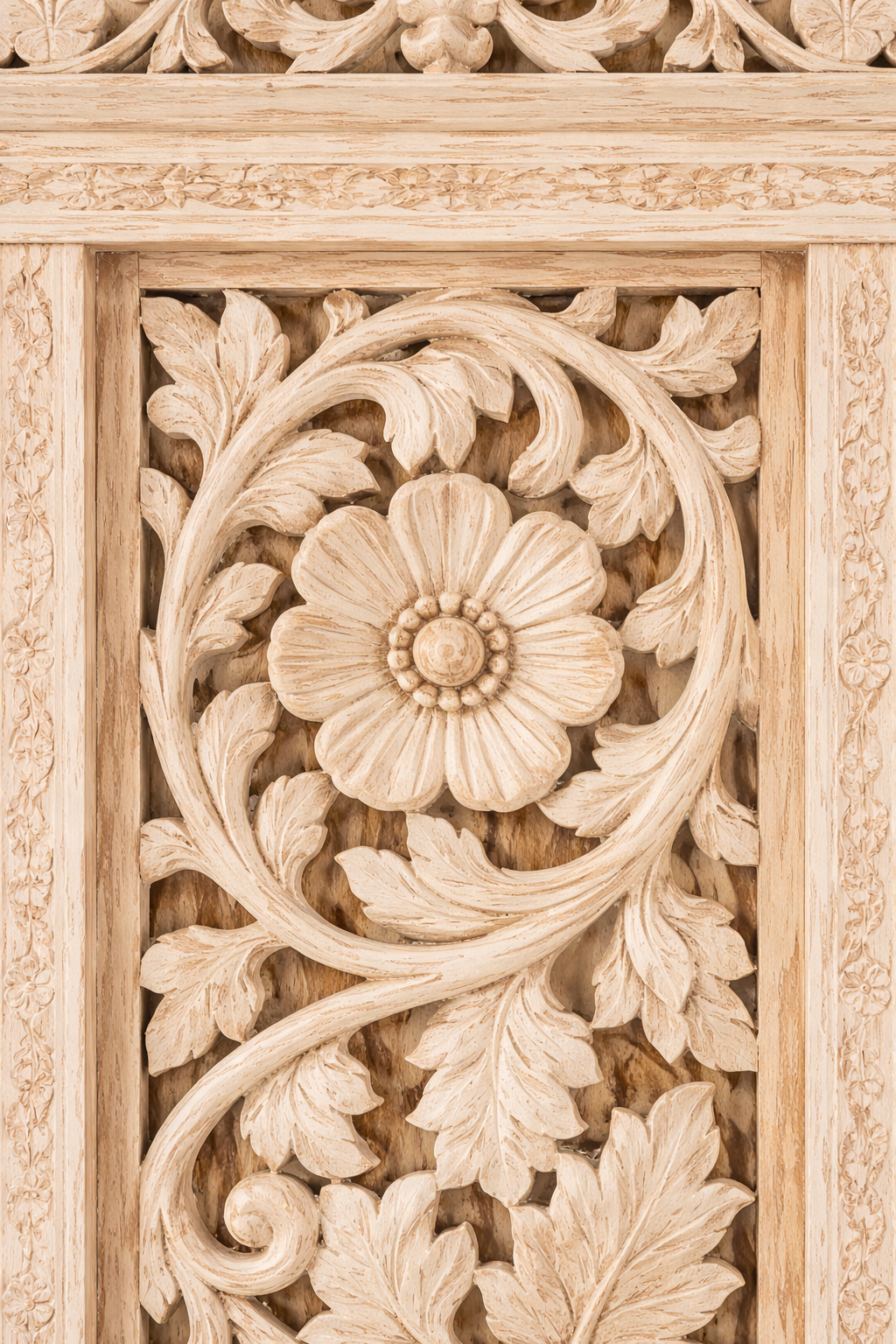 Acabado: decapado artesanal que resalta el tallado flora