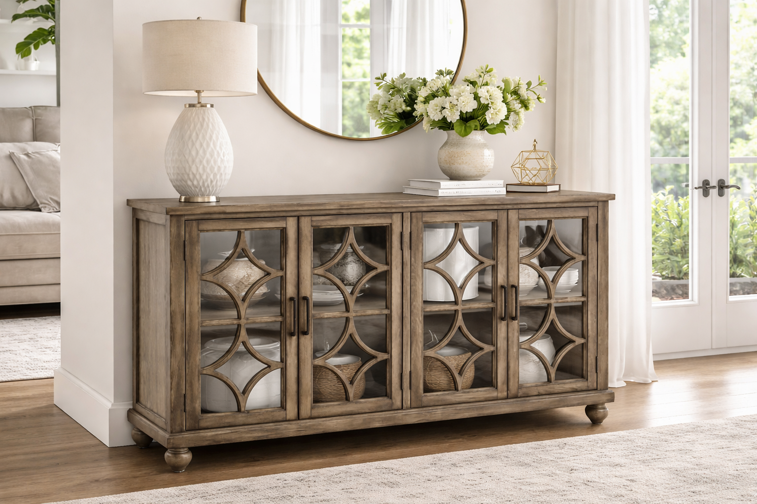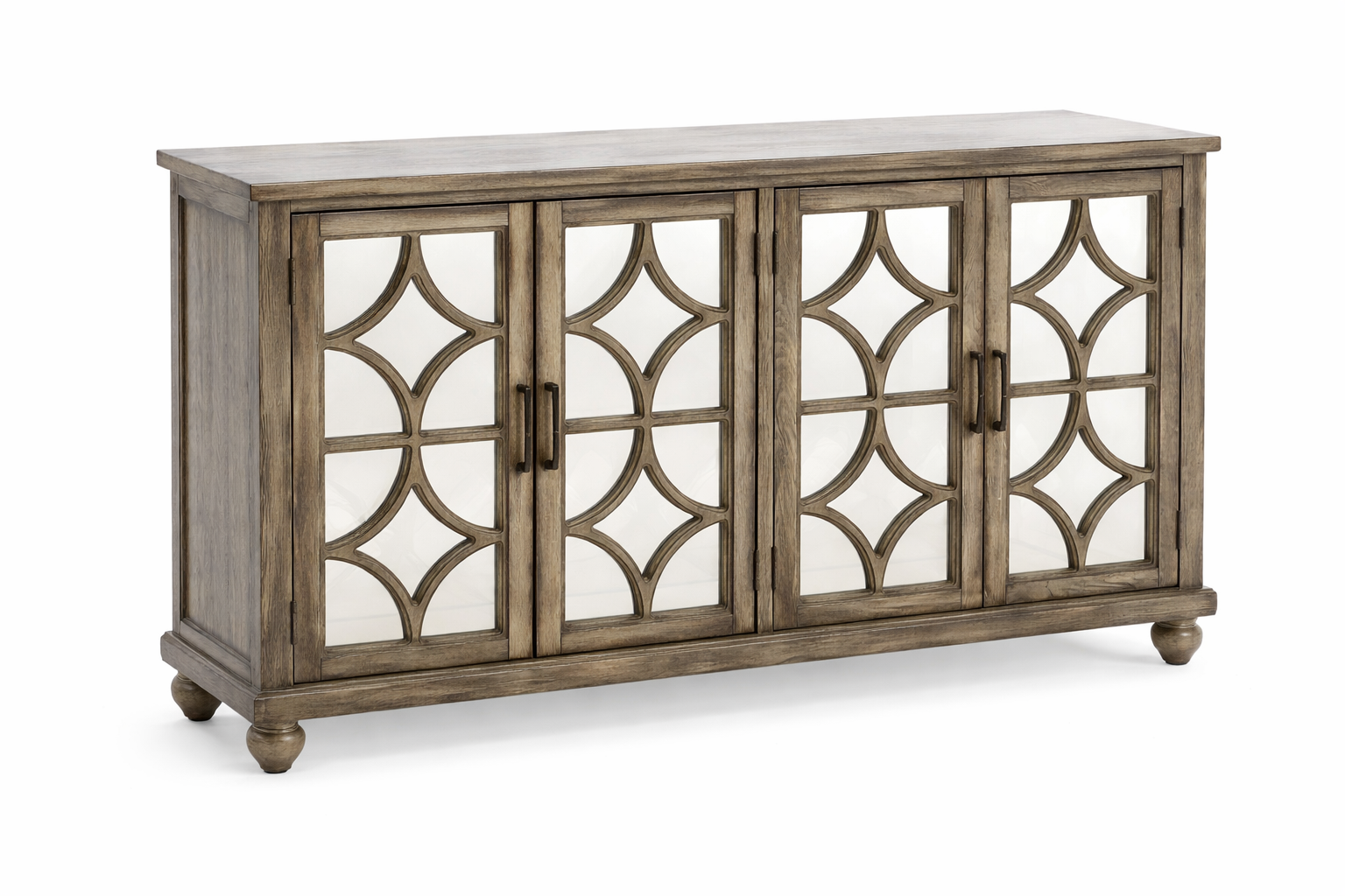 Este elegante buffet está fabricado con madera sólida, lo que garantiza una gran durabilidad y resistencia para un uso prolongado. Cuenta con frentes de puertas espejadas, que aportan un toque sofisticado y moderno, elevando el estilo de cualquier habitación y reflejando la luz para dar un efecto más luminoso al espacio.