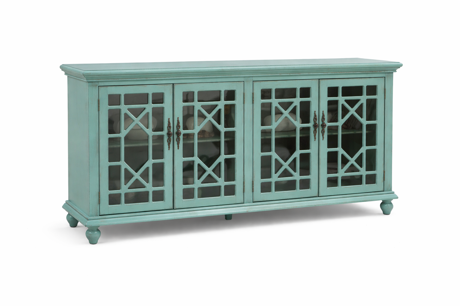 Este elegante buffet está fabricado con madera sólida, lo que garantiza durabilidad y resistencia a lo largo del tiempo. Cuenta con cuatro puertas de vidrio, que no solo le otorgan un aspecto sofisticado, sino que también permiten una fácil visualización del contenido interior, brindando un toque moderno y práctico a la decoración de tu hogar.
