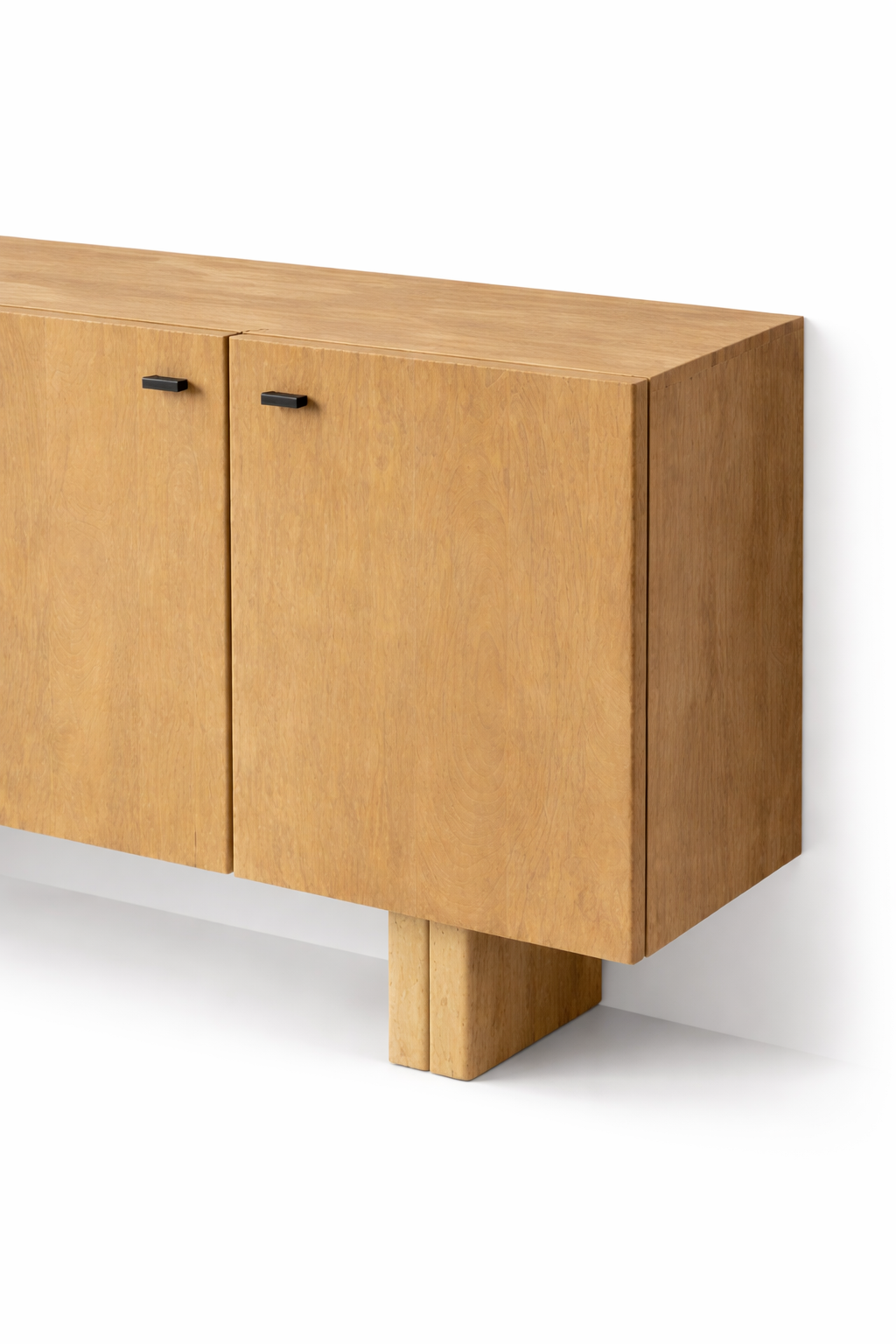 Elevado sobre sólidas patas rectangulares, este buffet facilita la limpieza del suelo y aporta una estética liviana y elegante. Su cubierta superior es ideal para exhibir elementos decorativos como lámparas, jarrones, cuadros o bandejas, permitiendo personalizar el espacio con un estilo sereno y acogedor.