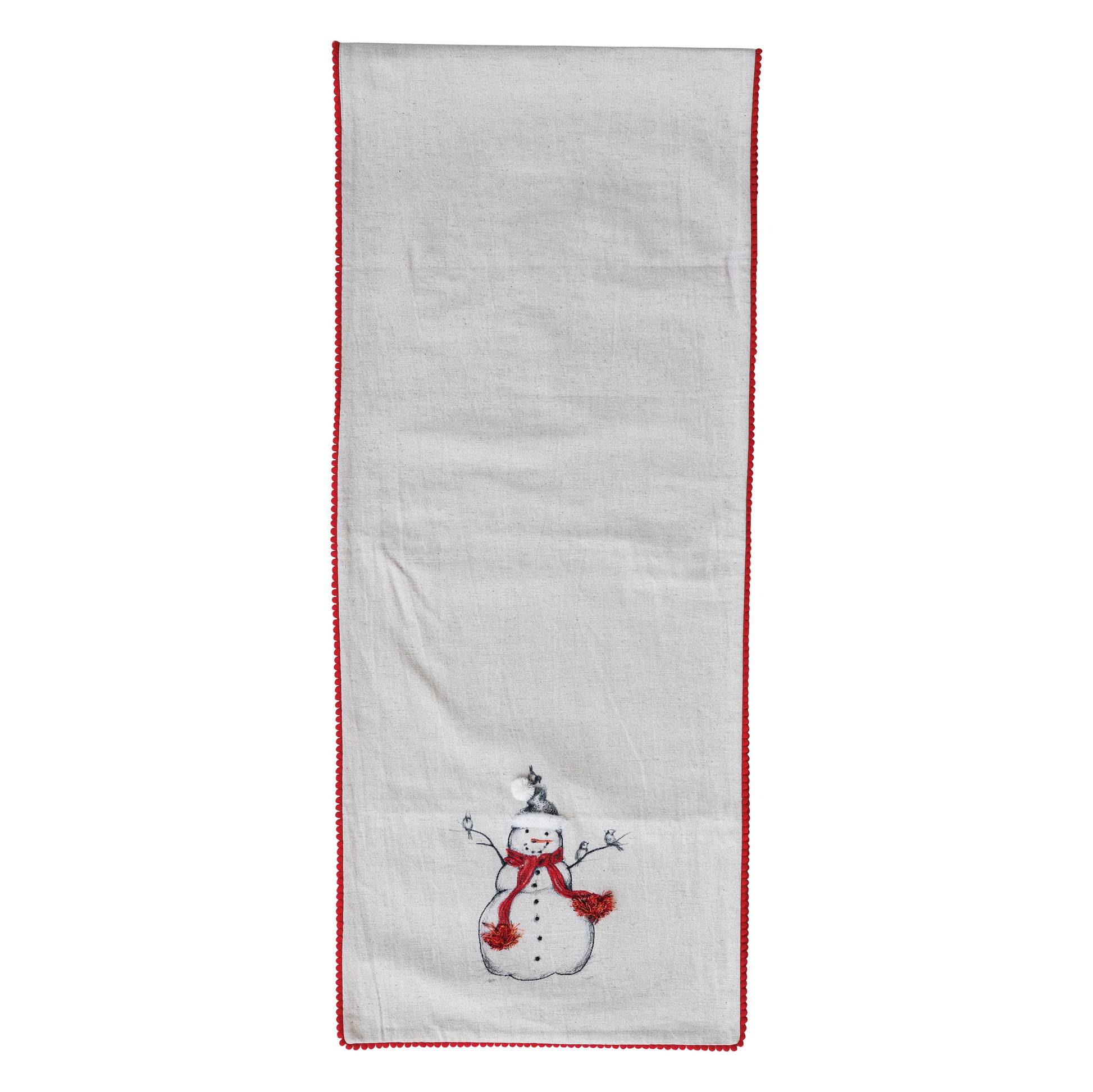 Decora tu mesa con un toque festivo y acogedor gracias a este camino de mesa de algodón con diseño bordado de muñeco de nieve. Los detalles en aplique y pompones aportan textura y encanto, convirtiéndolo en un accesorio ideal para la temporada navideña.
