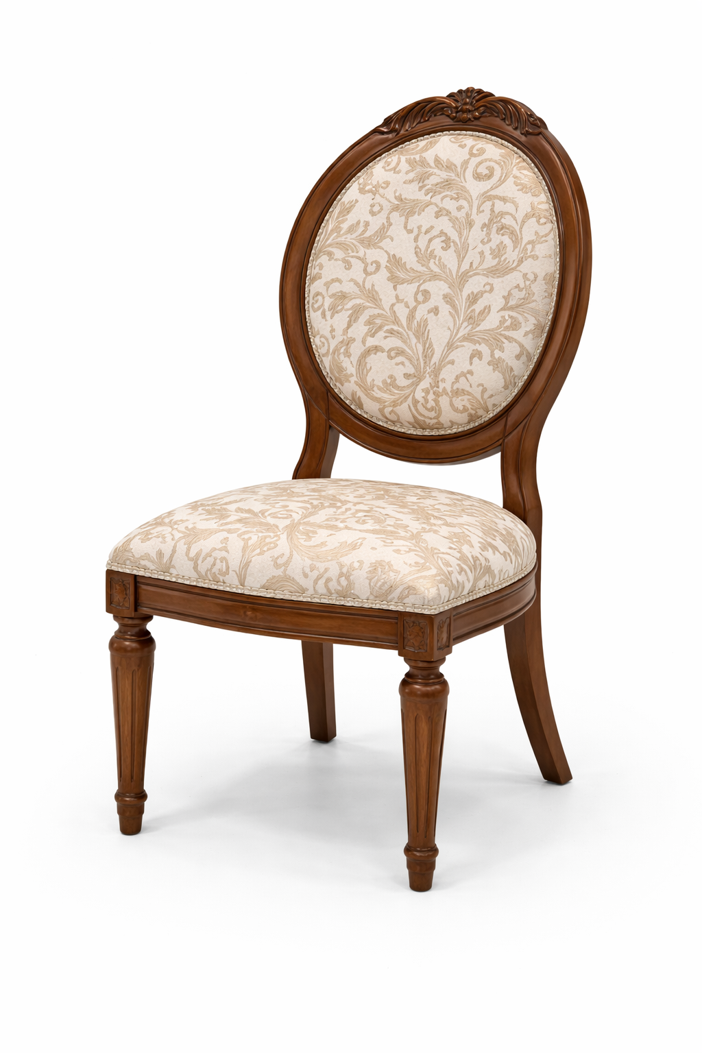 La mesa presenta un diseño robusto con terminaciones trabajadas y patas torneadas que realzan su estilo atemporal. El conjunto se completa con 6 sillas tapizadas, diseñadas para ofrecer un alto nivel de comodidad y un acabado refinado que armoniza perfectamente con la mesa.