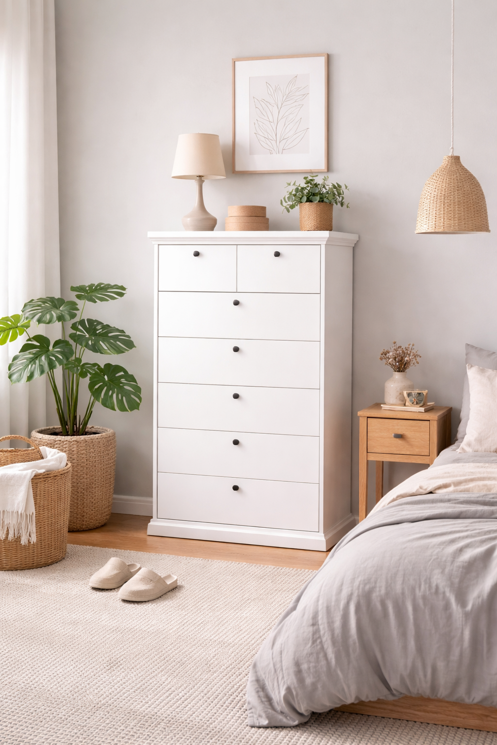 Con 7 cajones equipados con rieles metálicos, proporcionan un almacenamiento versátil y fácil acceso a tus pertenencias.