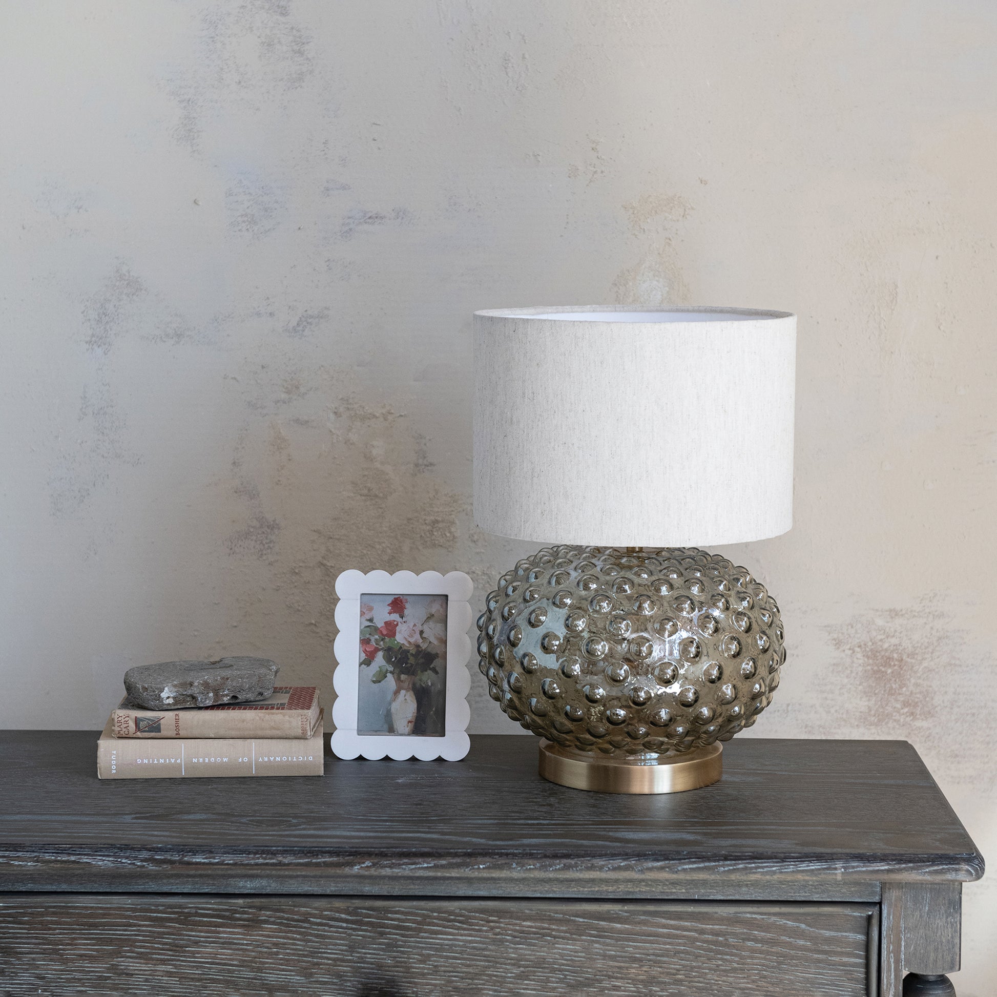 Añade un toque farmhouse elegante a tus espacios con esta lámpara de mesa de vidrio con diseño hobnail y base con acabado metálico. Su pantalla de algodón suaviza la luz, creando un ambiente acogedor y cálido.