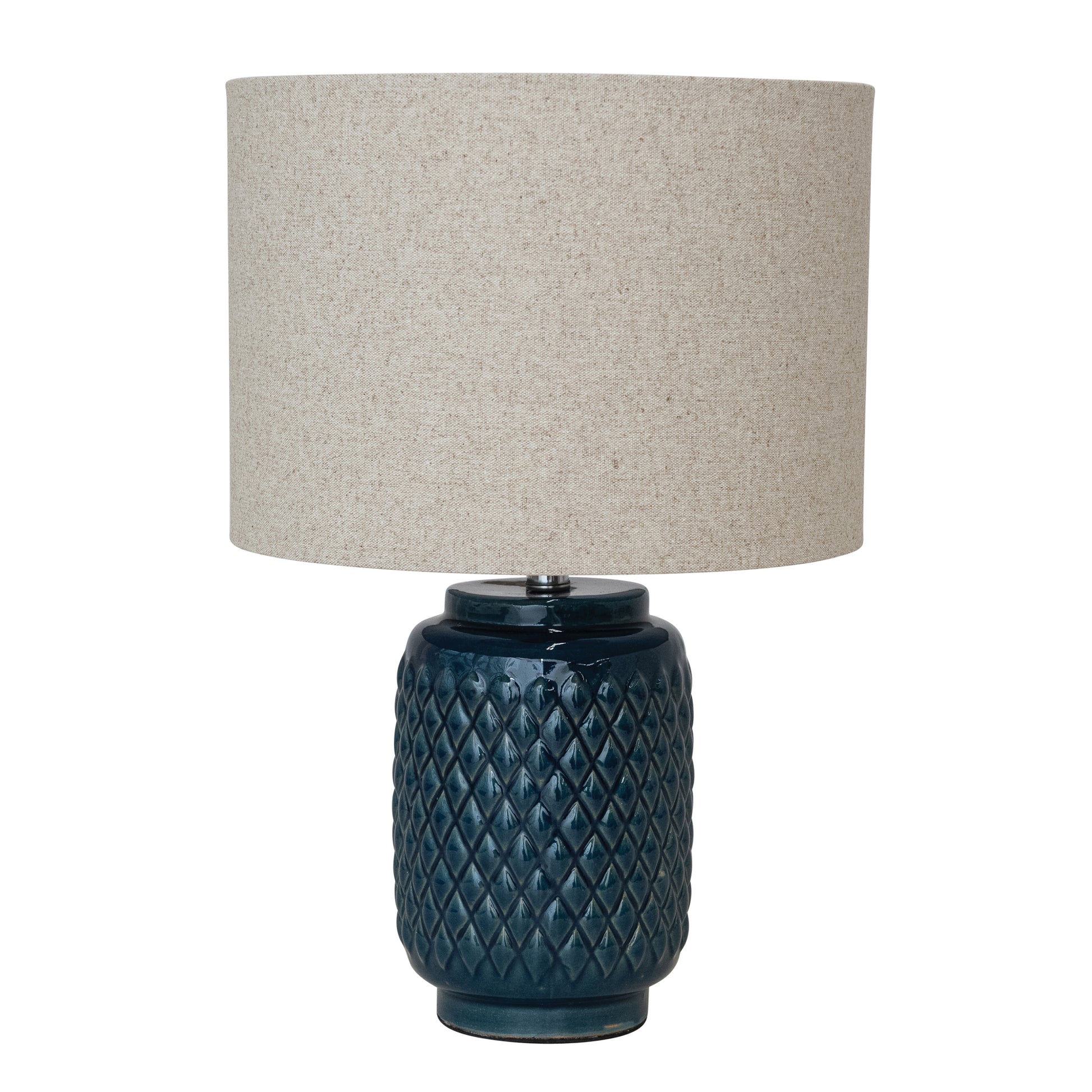 Agrega un toque de elegancia y textura a tus espacios con esta lámpara de mesa de cerámica con relieve y pantalla de lino. Su acabado glaseado reactivo en tonos azul y natural hace que cada pieza sea única, aportando carácter y estilo a cualquier habitación.