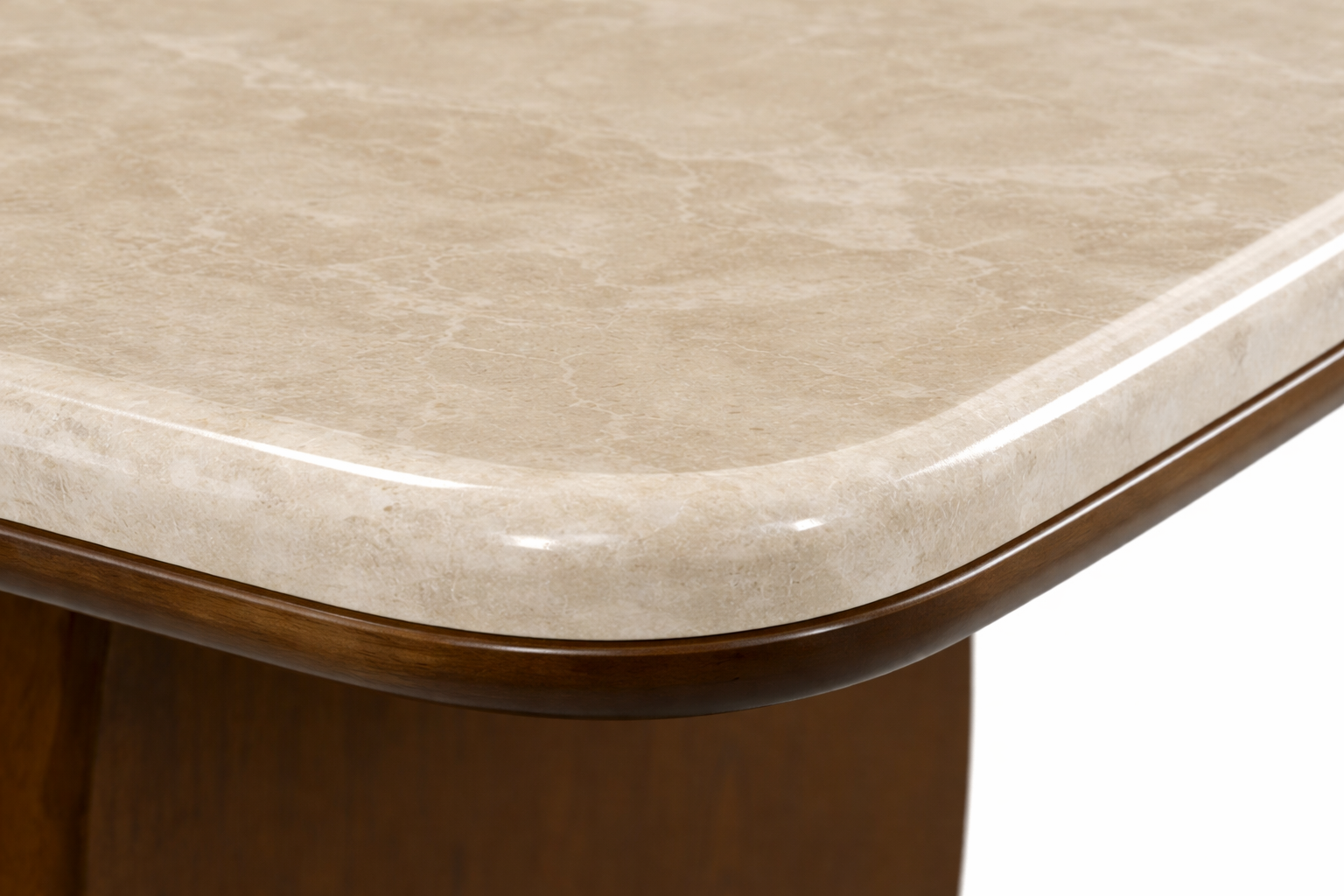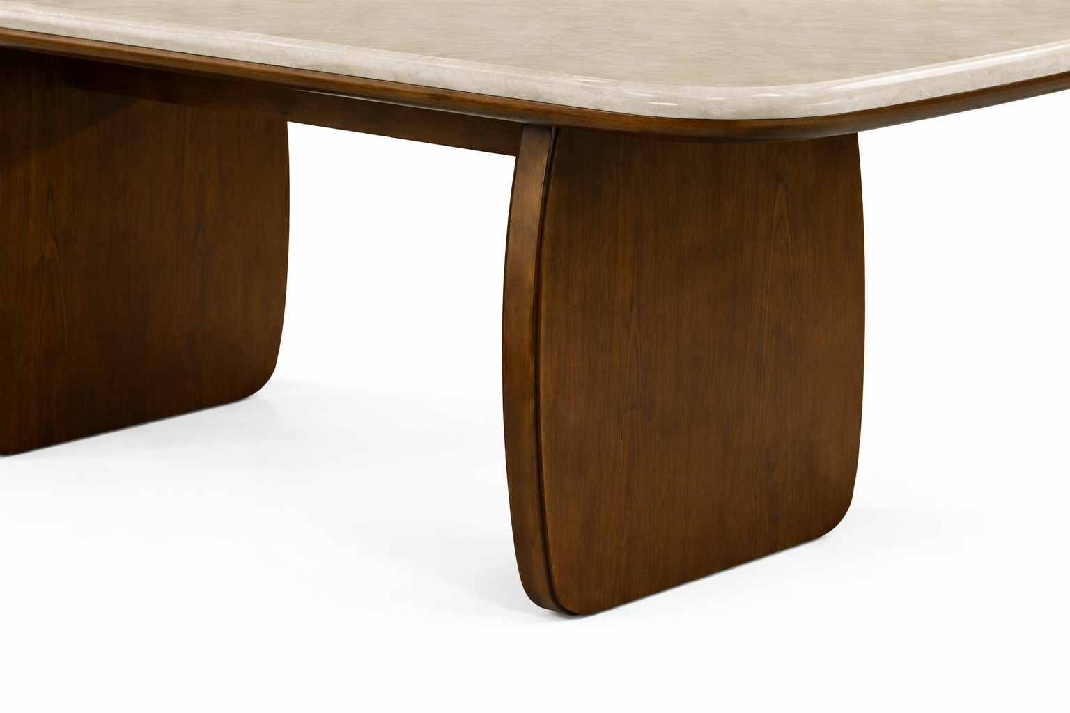 La mesa cuenta con una tapa de mármol natural Ultraman en tono beige, con vetas suaves y naturales que hacen que cada pieza sea única. Su forma quarter oval, con esquinas curvas, entrega un diseño más fluido, cómodo y seguro para el uso diario.
