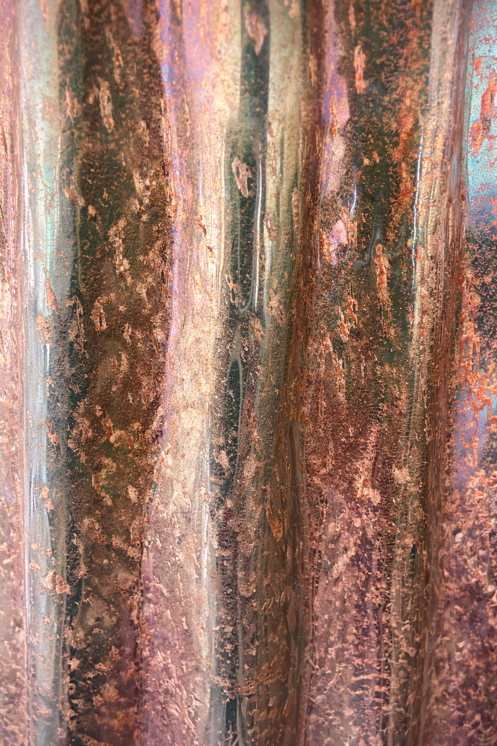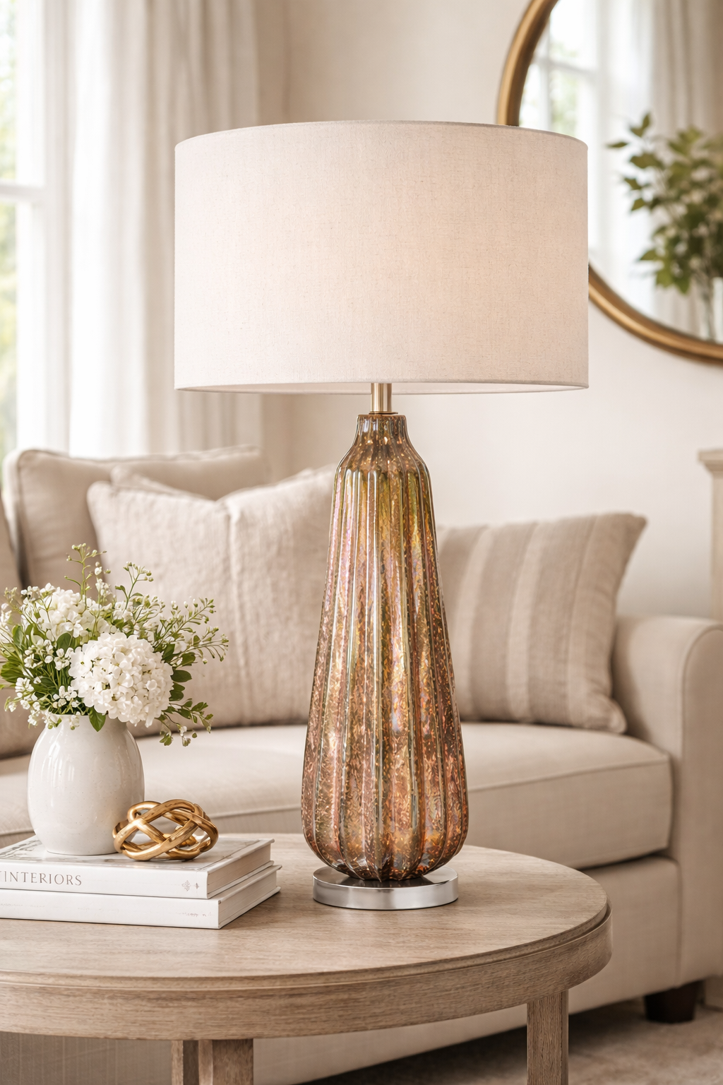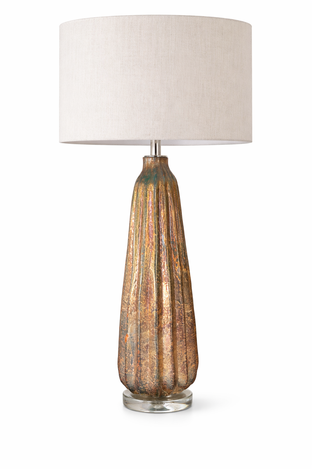 Ilumina y decora tus espacios con esta lámpara de mesa de diseño sofisticado y presencia elegante. Su base de vidrio texturizado con acabado iridiscente refleja sutiles tonos dorados, cobre y verdes, creando un efecto visual único que realza cualquier ambiente.