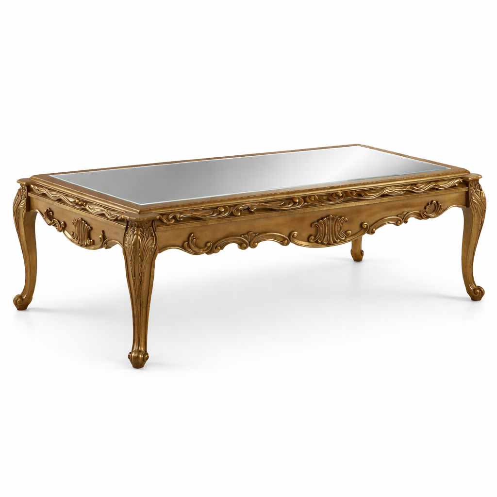 Esta mesa de centro de estilo tradicional es la pieza perfecta para quienes buscan añadir un toque de lujo y sofisticación a su hogar. Con un acabado en oro antiguo y tableros de mesa con espejo vintage incrustado, se convierte en un elemento decorativo único que elevará tu sala de estar a nuevas alturas de elegancia.