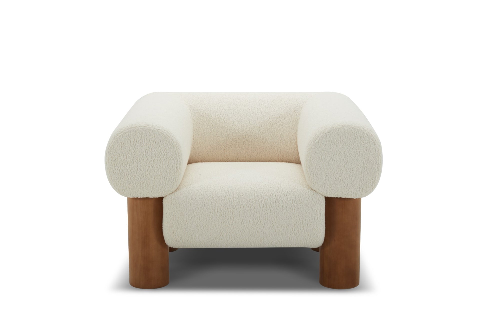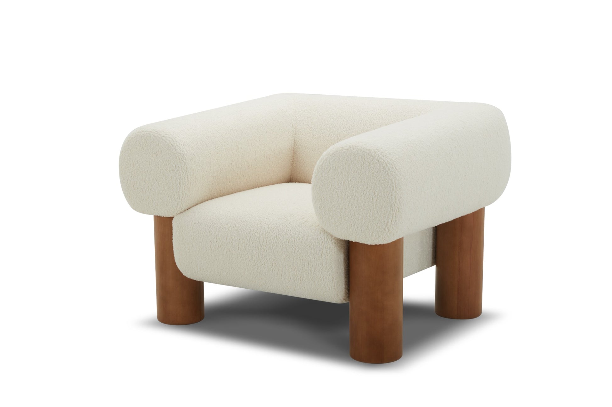 Su estructura descansa sobre patas cilíndricas de madera natural, firmes y elegantes, mientras su asiento profundo y los reposabrazos de 29 cm envuelven al usuario en una experiencia de comodidad total. Cada detalle está pensado para quienes buscan diseño contemporáneo sin renunciar al bienestar diario.