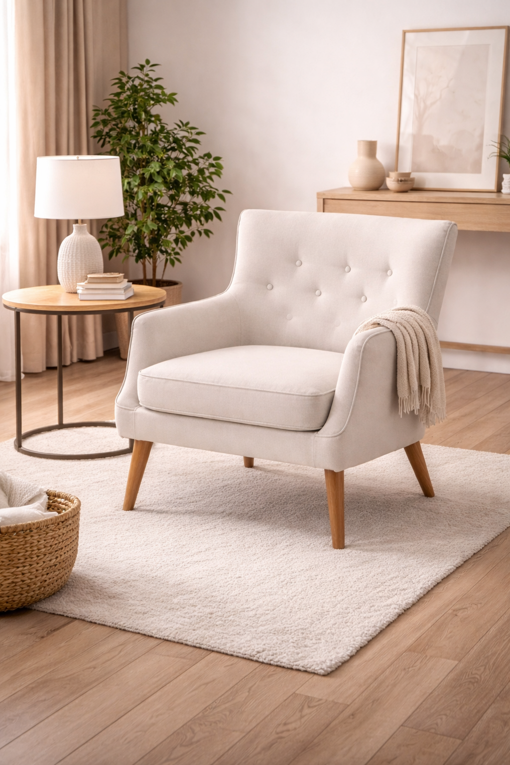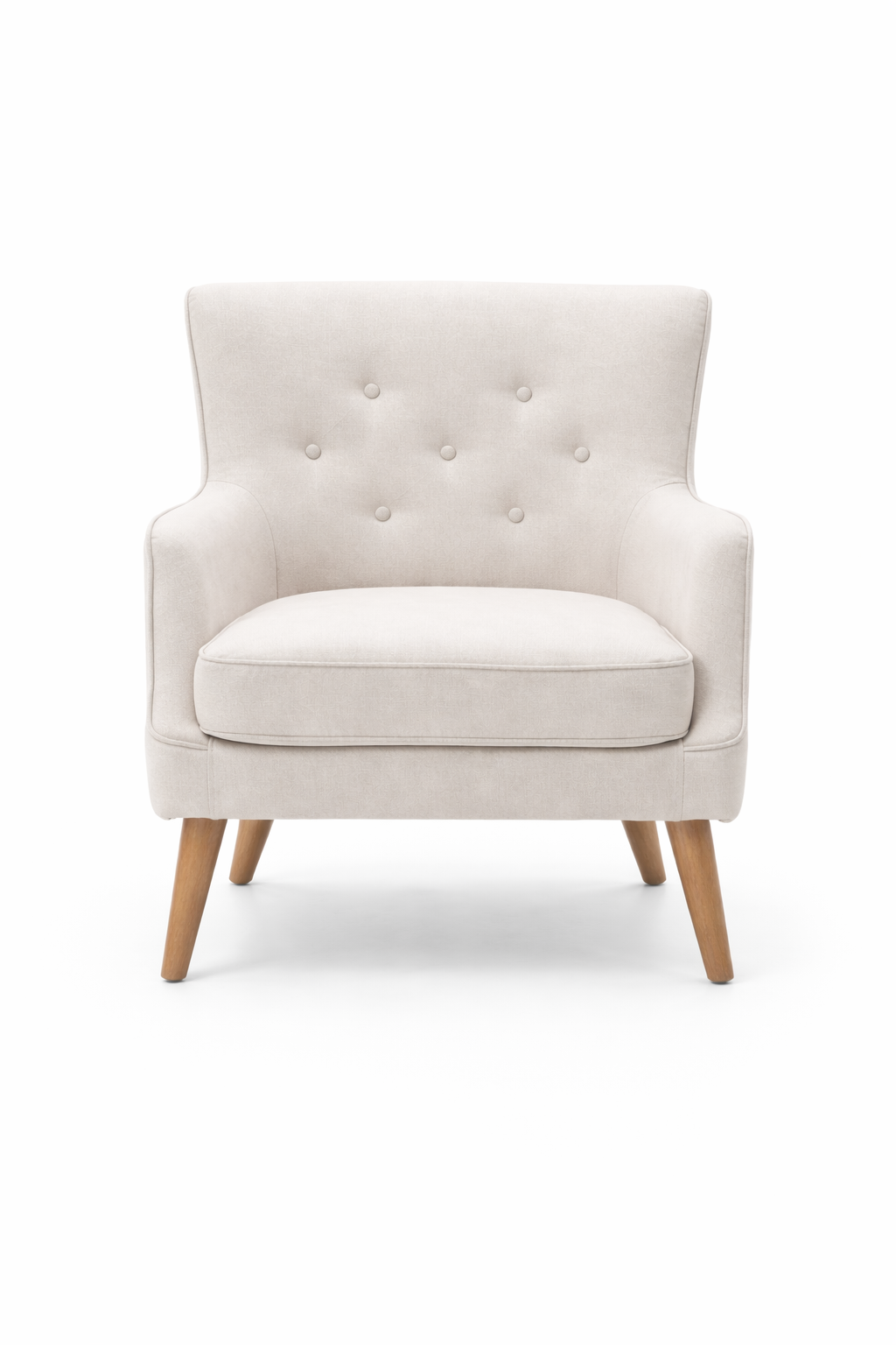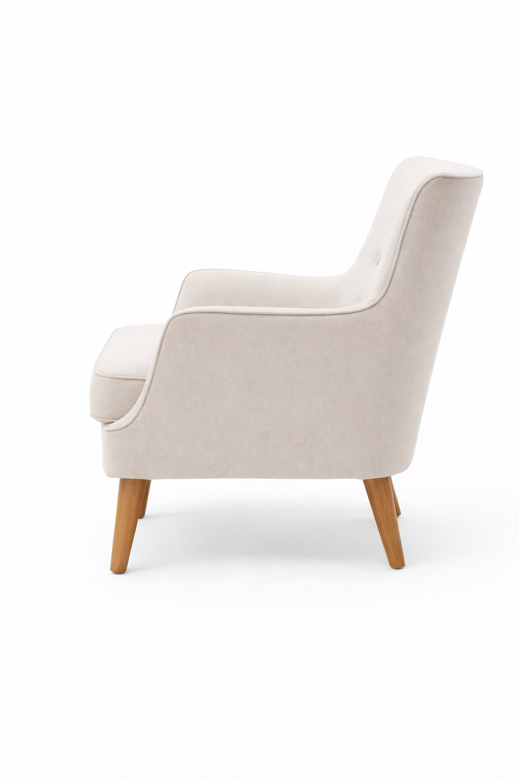 Las patas de madera en tono natural refuerzan su presencia cálida y versátil, ideal para ambientes escandinavos, contemporáneos o vintage. Su estructura está diseñada para ofrecer comodidad y soporte, con una altura total de 89 cm, 75 cm de ancho, y 80 cm de profundidad. El asiento se ubica a 47 cm del piso, y los apoyabrazos a 59 cm, asegurando una postura ergonómica y cómoda.