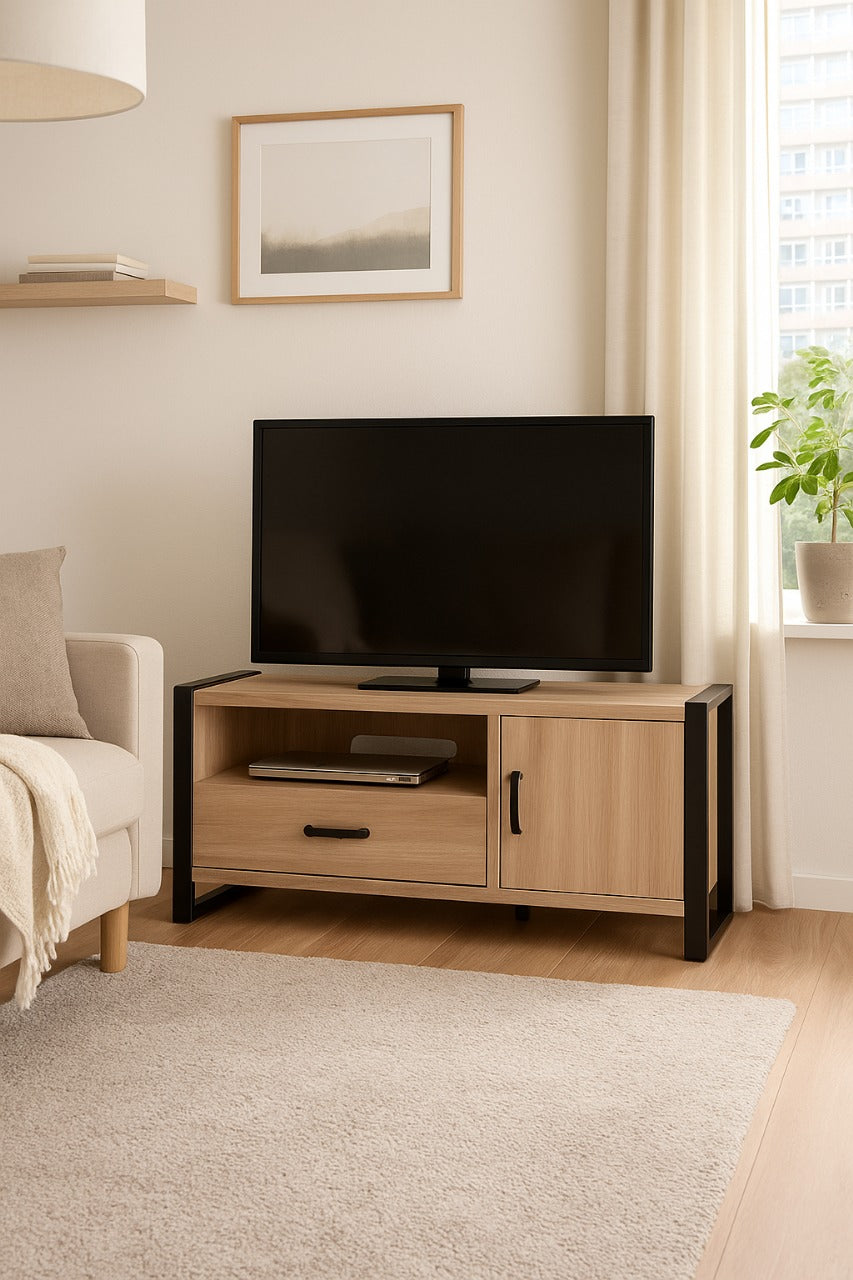 El Rack TV Roble Urbano combina el encanto cálido del roble con una estructura metálica negra que aporta un toque industrial moderno. Con un diseño funcional y estético, cuenta con un amplio compartimento abierto para dispositivos, un cajón central para almacenamiento y una puerta lateral que mantiene todo en orden. Sus líneas limpias y acabados resistentes lo convierten en una pieza versátil para cualquier sala de estar.