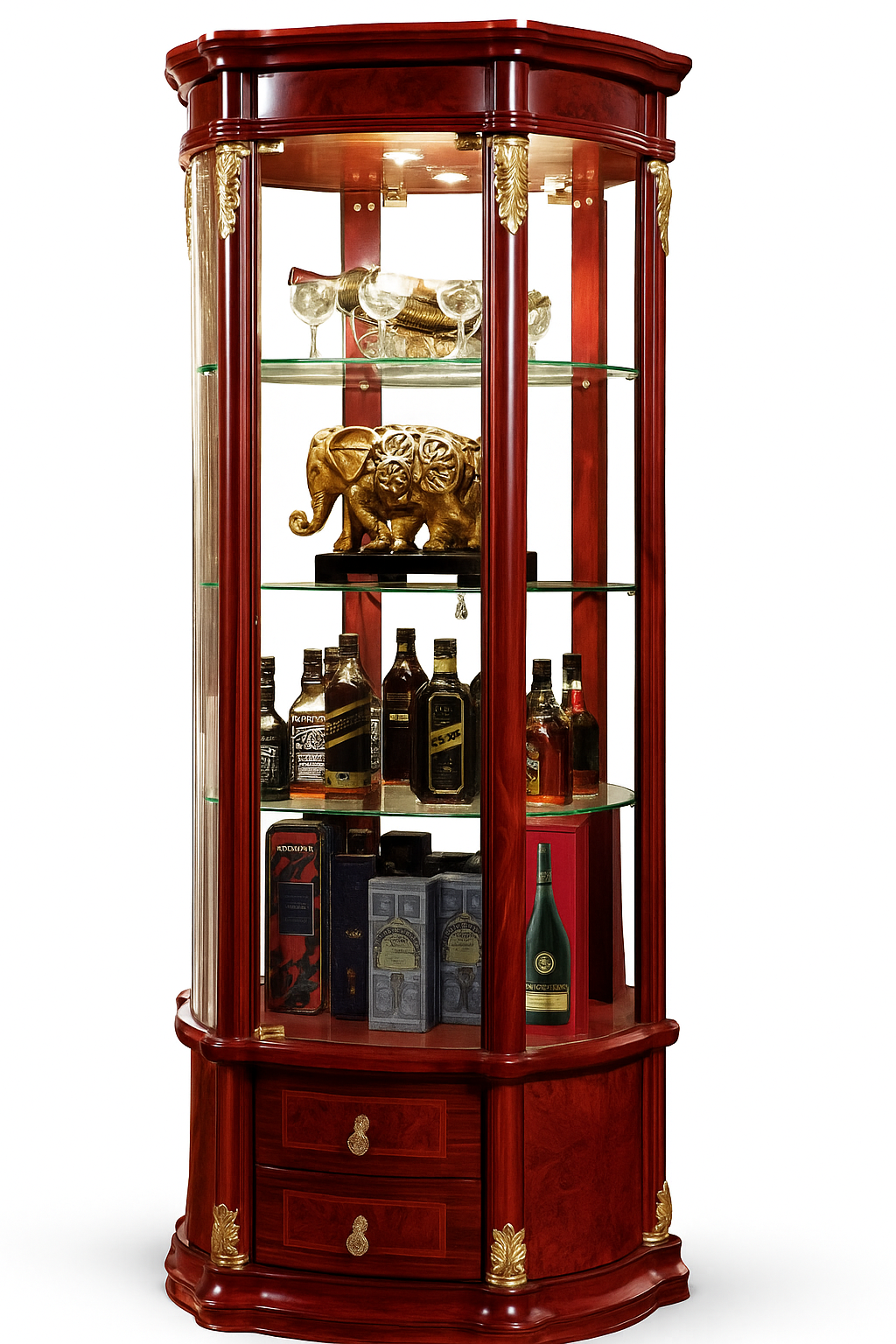 Te presentamos la Vitrina Ébano, una pieza de lujo que destaca por su diseño curvo en forma de media luna, fabricada con madera de caucho nativa y un acabado en color cherry que resalta su elegancia. Con dimensiones de 92 cm de ancho, 46 cm de profundidad y 210 cm de altura, esta vitrina es el complemento ideal para cualquier espacio que busque una combinación de estilo y funcionalidad.